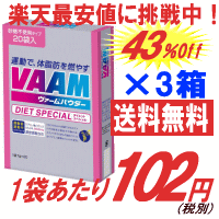 【送料無料!】明治 ヴァームパウダー ダイエットスペシャル 7g×20袋×3箱【60袋】〔43%OFF〕 価格: 6,426円 レビュー評価: 4.68 レビュー数:34 1袋あたり102円 (税別)(バーム)☆常温で保存可能! 賞味期限:2010年8月もしくはそれ以降。メーカー直入荷最新の商品をお届けいたします!※こちらの商品は送料込みです。(※沖縄県のみ追加料金有。)★写真は20袋入です。写真のものが3箱(計60袋)のお届けになります。○明治乳業 VAAM ●独自バランスの17アミノ酸素材V.A.A.M. 3,000mg の砂糖不使用のパウダータイプ。ヴァームパウダーと同じV.A.A.M.含有量を維持しながら、砂糖を使用せず、従来の1袋42kcalから27kcalへと低カロリー化しました。ダイエットや健康に関心を持つ方におすすめです。○1袋でヴァームダイエッ Supported by 楽天ウェブサービス |
